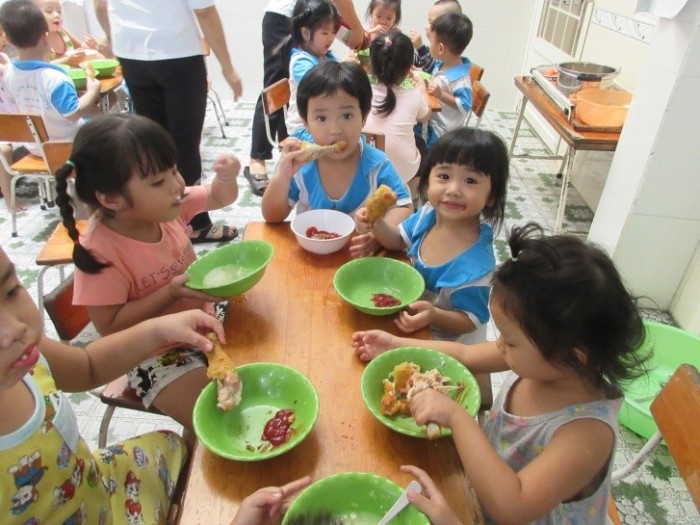 Als de kleuters toekomen krijgen ze een ontbijt, in de voormiddag een tas melk, 's middags een maaltijd en een vieruurtje. Enkele kinderen worden geholpen bij het eten geven.
